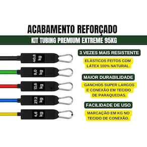 Tubing PREMIUM Extreme Carga Máxima Elástico Exercício Bravus Kit Tubing Premium Extreme - Carga Máxima 95 kg Acabamento Super Reforçado e Elásticos 100% Látex Natural Qualidade Premium O Kit Tubing Premium Extreme Bravus Sport foi feito para os usuários mais exigentes e que buscam um produto de alta resistência para superar todos os limites e levar seu treino para outro nível. Combine 5 elásticos de diferentes resistências e crie diversos níveis de carga de acordo ao seu perfil de treino O elástico tubing antipressão é feito de material de qualidade premium, 100% látex natural, o que gera uma resistência dupla. Os mosquetões de aço resistente e as tiras firmemente costuradas também evitam o rasgo, mesmo sob a extrema resistência ao estiramento. Treine em alta intensidade e sem preocupações, pois esse é um equipamento feito especialmente para você que é super exigente e focado em superar todos os limites O Kit Premium vem com 5 elásticos de borracha em forma de tubo duplamente reforçados, feitos de látex 100% Natural. Cada elástico tem 1,20 m de comprimento com garras em metal de alto calibre e que permitem um treino muito mais potente. É possível realizar os exercícios usando vários elásticos ao mesmo tempo, criando assim, mais de 50 níveis diferentes de resistência. O Kit Premium Bravus é tão completo que é possível fazer exercícios para trabalhar diversos grupos musculares tanto superiores, como: braços, peitoral e costas, quanto inferiores: glúteos, coxas, pernas e panturrilhas. O kit Inclui:1 elástico de 4.6 kg de resistência1 elástico de 9.0 kg de resistência1 elástico de 13.6 kg de resistência1 elástico de 27.2kg de resistência1 elástico de 40.8 kg de resistência2 alças de mão acolchoadas 2 tiras para tornozelo1 âncora para colocar na porta1 sacola de transporte