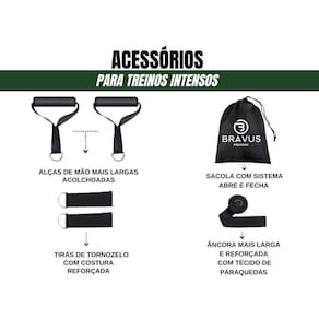 É possível realizar os exercícios usando vários elásticos ao mesmo tempo, criando assim, mais de 50 níveis diferentes de resistência. O Kit Premium Bravus é tão completo que é possível fazer exercícios para trabalhar diversos grupos musculares tanto superiores, como: braços, peitoral e costas, quanto inferiores: glúteos, coxas, pernas e panturrilhas.