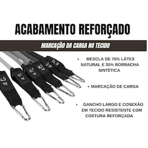 Tubing pro extreme elástico extensor carga 95kg Kit tubing extreme pro 95kg Chegou a hora de aumentar a carga do seu treino e ultrapassar todos os limites com o novo kit tubing extreme pro 95kg São 6 elásticos tubings com diferentes resistências totalizando 95 quilos de carga o novo tubing extreme bravus se adapta a diferentes níveis de treino, do nível iniciante com as cargas mais leves, entre 4,5kg e 9,1 kg até o nível avançado, com elásticos com cargas de 13,7, 18,2, 22,7 e 27kg A nova linha kit tubing extreme 95 kg bravus pro 12 peças vem com acabamento reforçado. O elástico tubing é conectado em um tecido de alta resistência, com marcação do peso correspondente em kg e ganchos largos Diferencial 1. Elástico tubing antipressão de látex de alta qualidade em degradê cinza 2. Mosquetões largos em aço resistente 3. Tiras em tecido reforçado com costura firme 4. Marcação do peso no tecido 5. 6 resistências diferentes, incluindo a nova carga de 27kg 6. Carga máxima de 95 quilos Cada elástico tem 1,20 m de comprimento com garras em metal. Todas as imagens do anúncio correspondem ao produto real. É possível realizar os exercícios usando 1 ou até 6 elásticos ao mesmo tempo, criando assim, mais de 40 níveis diferentes de resistência. O novo kit tubing extreme pro 95kg é tão completo que é possível fazer exercícios para trabalhar diversos grupos musculares - tanto superiores, como: braços, peitoral e costas, quanto inferiores: glúteos, coxas, pernas e panturrilhas. Finalidade: ganho de força, resistência, aumento de massa magra, tonificação muscular e melhora de condicionamento físico O kit inclui: 1 elástico cinza super claro de 4,5 kg de resistência 1 elástico cinza claro de 9,1 kg de resistência 1 elástico cinza médio de 13,7 kg de resistência 1 elástico cinza escuro de 18,2kg de resistência 1 elástico preto de 22,7 kg de resistência 1 elástico preto intenso de 27 kg de resistência 2 alças de mão revestidas de espuma 2 tiras para tornozelo 1 âncora para colocar na porta 1 bolsa em nylon