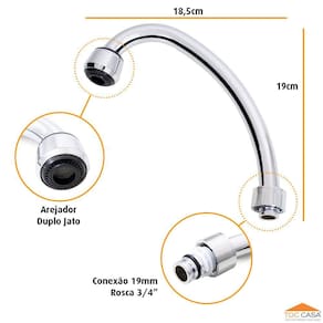 Possui design sofisticado e material de excelente qualidade, com Bica e arejador produzidos em ABS cromado, arejador possui duplo jato que permite alterar facilmente de jato chuveirinho para jato continuo, além de colaborar com a economia de água, confere praticidade tornando-a ideal para sua torneira de cozinha.