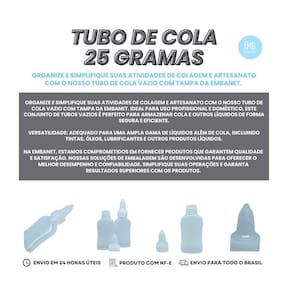 Tubo de Cola Vazio com Tampa - Loja Oficial Embanet Organize e simplifique suas atividades de colagem e artesanato com o nosso Tubo de Cola Vazio com Tampa da Embanet. Ideal para e doméstico, este conjunto de tubos vazios é perfeito para armazenar cola e outros líquidos de forma segura e eficiente. Contém: 5 tubos vazios com tampas. Altura do Frasco: 7,3 cm Altura da Tampa: 3,4 cm Altura Total Fechado : 9,6 cm Largura: 1,9 cm Capacidade: 25g Fabricados em PEAD Polietileno de Alta Densidade , esses tubos são altamente resistentes e duráveis, garantindo que seu conteúdo esteja sempre protegido. O PEAD é conhecido por sua robustez e resistência a impactos, tornando-o perfeito para aplicações repetidas. Conheça Mais Produtos na Loja Oficial EMBANET: A Embanet oferece produtos projetados para atender às suas necessidades mais exigentes, sempre com a qualidade que você merece. Escolha a Qualidade EMBANET Hoje Mesmo Marca: Não Informado