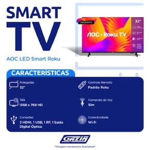 Tv 32p Aoc Led Smart Roku Wifi Hd Hdmi - 32s5155/78g Outras informações Imagem/display Tamanho da tela: 32 Processado / Engine de imagem: Quad core Tipo de painel: DLED Design: sem bordas Resolução do painel: HD 720p Frequência: 60 Hz Proporção de tela: 16:9 Ã&130;ngulo de visão: 178 Brilho: 200 cd/m Tempo de resposta: Homologação Anatel: 166292013501 Marca: Não Informado