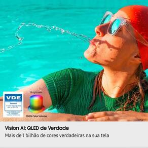 Smart TV QLED 4K com Quantum Dot, Processador IA Q4, Quantum HDR, Som em Movimento Virtual, Smart TV Tizen com 7 anos de atualização, Compatível com assistentes de voz, Gaming Hub, Multitela até 2 conteúdos, ALLM, Tela ultra wide e menu de jogo, Wi-Fi 5, Bluetooth 5.3, Design Slim com 3 bordas infinitas.Tamanho da tela
