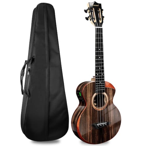 Ukulele elétrico e acústico tenor brilhante Butterfly Bocote - Design de corte e apoio de braço: Habilmente feito à mão com um corte lindamente projetado e apoio de braço elegantemente moldado, ambos feitos de padauk vermelho premium, proporcionando acesso sem esforço a trastes mais altos e garantindo conforto durante sessões de jogo prolongadas. O rico contraste dos tons vermelhos quentes contra o elegante corpo de ébano preto cria uma estética elevada que melhora a elegância geral do instrumento. - Artesanato genuíno feito à mão: ao contrário de muitas outras marcas que dependem da produção de fábrica, a Caramel Ukulele se orgulha de sua construção autêntica feita à mão. Cada ukulele é meticulosamente trabalhado por sua equipe qualificada, com o mínimo de uso de máquinas. Esta abordagem prática garante qualidade superior e atenção aos detalhes. - Acabamento brilhante requintado: TEG91 apresenta um acabamento brilhante exclusivo que os diferencia dos ukuleles padrão. Semelhante ao processo meticuloso utilizado para acabamentos de laca de piano, cada ukulele passa por várias rodadas de polimento cuidadoso. O resultado é uma aparência deslumbrante, durável e brilhante que chama a atenção. - Cordas de fibra de carbono para desempenho excepcional: as cordas de ukulele especialmente projetadas da Caramel foram amplamente testadas e são conhecidas por sua excelente jogabilidade e tom claro. Estas cordas de fibra de carbono proporcionam uma experiência de toque confortável enquanto produzem uma qualidade de som rica e ressonante, tornando-as perfeitas para músicos iniciantes e experientes. - Máquina de afinação premium para desempenho confiável: os ukuleles Caramel se destacam com suas máquinas de afinação de alta qualidade. Geralmente encontrados em instrumentos artesanais de alto preço, esses afinadores apresentam um tom preto elegante, textura metálica forte e polimento requintado. Com uma relação de engrenagem 18: 1 atualizada, esses sintonizadores oferecem ajuste preciso e confiável, garantindo que seu ukulele permaneça perfeitamente afinado.