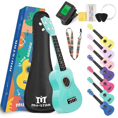 - ?. Tudo o que você precisa para um kit de ukulele soprano está aqui: 1 ukulele de 21 polegadas, 1 bolsa de presente, 1 sintonizador digital com clipe, 1 alça, 1 cordão de nylon de reposição, 2 palitos de dedo, 1 adesivo de escala e 1 pano de limpeza.