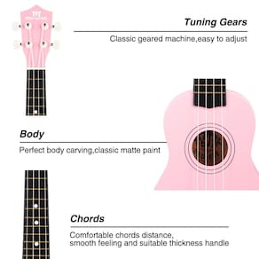 - ?. Tampo e base de tília com acabamento de alto brilho em cores vivas, tornam o som quente, claro e agradável quando você toca músicas tradicionais de ukulele soprano. O sintonizador digital clip-on é fácil de ajustar e tocar, o que pode ajudar os iniciantes a aprender convenientemente.