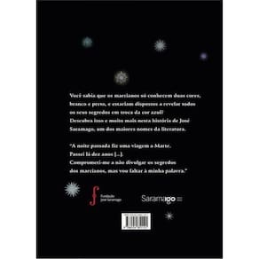Nesta história para leitores de todas as idades, a escrita incomparável de José Saramago nos transporta em uma viagem espacial até uma utopia em Marte. O narrador desta história quebra a promessa de manter segredo e nos conta sobre sua incrível jornada extraterrestre. Em sua viagem espacial, ele foi parar em Marte e, durante sua estadia no planeta, observou que os habitantes de lá viviam em paz e harmonia, sem guerras. Porém, lá só existiam duas cores: o branco e o preto, e suas gradações de tonalidades. Foi então que lhe surgiu uma ideia: e se os marcianos concordassem em trocar seus valiosos saberes por uma chance de conhecer as cores do planeta Terra? Com sua habilidade única de criar e brincar com palavras e ideias, Saramago constrói um paralelo utópico entre Marte e a Terra, comparando os nossos modos humanos de viver com os dos marcianos. Ao levar os leitores para um novo mundo, o consagrado autor os convida a refletir sobre seu próprio planeta. Para tornar a viagem ainda mais palpável, as ilustrações da premiada artista argentina Claudia Legnazzi trazem um toque autêntico ao conto, dando vida e personalidade à civilização alienígena. Indicado para leitores a partir de 9 anos. Marca: Não Informado