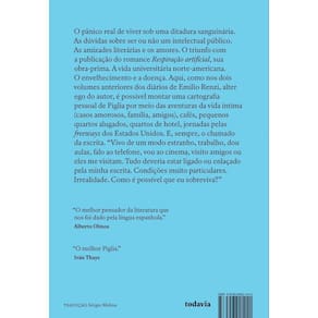 O pa^nico de viver sob uma ditadura. As du´vidas sobre ser ou na~o um intelectual pu´blico. As amizades litera´rias e os amores. O triunfo com a publicac¸a~o de Respirac¸a~o artificial, sua obra-prima. O envelhecimento e a doenc¸a. Aqui, como nos dois volumes anteriores dos dia´rios de Emilio Renzi, alter ego do autor, e´ possi´vel montar uma cartografia pessoal de Piglia por meio das aventuras da vida i´ntima, cafe´s, quartos de hotel. E, sempre, o chamado da escrita.