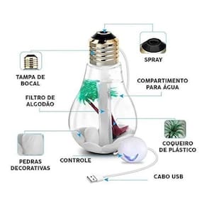 Lampada umidificador climatizador aromatizador de ar ambiente luz led usb aroma bivolt abajur colorido 16 cores portatil Lampada umidificador climatizador aromatizador de ar luz led ambiente Umidificador aromatizador de ar e luminária em formato de lampada, com uma pequena praia dentro. Conexão padrão usb. Pode ser usada na tomoda se utilizada adaptador de tomada bivolt