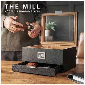 DESIGN MODERNO: É hora de uma abordagem moderna para armazenar charutos. O humidor Mill é finalizado com uma textura minimalista de madeira preta fosca e alças de metal sólido modernas. Reduzimos a moldura de madeira ao redor do vidro para um visual mais fino, aumentando a capacidade total para mais charutos. GAVETA DE ACESSÓRIOS: Armazene seu isqueiro, cortador, estojo de viagem e outros acessórios Klaro na gaveta forrada de feltro. HIGRÔMETRO DIGITAL: Os higrômetros digitais são ideais para obter uma leitura precisa dentro do humidor. SISTEMA DE PEG NOVO: O Humidor Mill Glass Top apresenta o novo sistema patenteado de Peg. UMIDADE PRONTA PARA USAR: Incluído o Sistema Hydro, um sistema de umidificação de charutos preciso e de baixa manutenção.