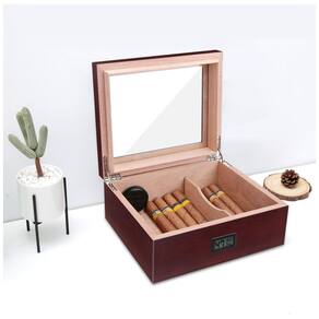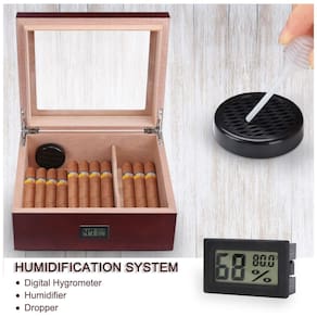Este umidor de charuto vem equipado com um higrômetro digital embutido, garantindo a monitoração precisa e adequada da umidade. Feito em autêntico cedro espanhol com excelente capacidade de vedação, possui uma fragrância única e retém a umidade de forma eficaz. Com um elegante acabamento em nogueira, janela de vidro temperado e fundo forrado com feltro anti riscos, este umidor de mesa é capaz de armazenar até 25-50 charutos. Acompanha um umidificador para manter seus charutos sempre na temperatura ideal. Além disso, seu design sofisticado o torna um presente perfeito para os amantes de charutos. Desfrute da qualidade Bald Eagle de dentro para fora.