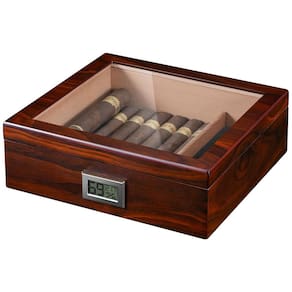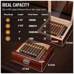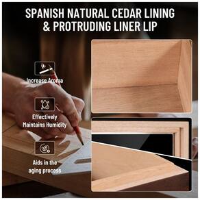 Design de Vedação Excelente: O lábio saliente do revestimento se encaixa perfeitamente contra o interior da tampa, proporcionando uma vedação segura que mantém níveis ideais de umidade interna. O revestimento de cedro espanhol absorve umidade de forma excepcional, estabilizando o ambiente de umidade no umidor enquanto emite um aroma distinto que realça o sabor dos charutos. Higrômetro Digital Preciso: Equipado com um sensor de umidade de última geração que atualiza as leituras a cada 10 segundos, monitorando com precisão os níveis de temperatura e umidade. Os dados em tempo real permitem ao umidificador regular eficazmente a umidade, garantindo que seus charutos permaneçam em condições ideais durante o armazenamento. Espaço de Armazenamento Amplo: Projetado com um interior espaçoso capaz de armazenar até 60 charutos, dependendo do calibre. Além disso, o divisor de cedro incluso ajuda a organizar seus charutos e evita o contato direto com o umidificador, garantindo condições ideais para cada charuto. Aparência Exclusiva e Elegante: Com um acabamento em nogueira conhecido por sua excelente resistência a riscos, esta umidor possui um interior espaçoso que atende suas necessidades de armazenamento, enquanto o revestimento de cedro aprimora o processo de envelhecimento dos charutos. Um presente ideal para pais, maridos e entusiastas de charutos - verdadeiramente a escolha perfeita para qualquer amante de charutos.