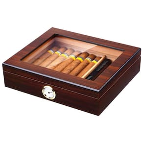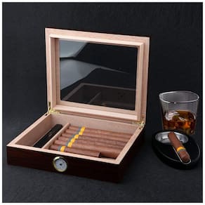 Feito artesanalmente com a melhor madeira genuína de cedro espanhol, este umidor pode armazenar até 25 charutos. Com um acabamento rico em Nogueira, tampa de vidro e design deslumbrante, este umidor de charutos vem com um umidor de charutos, humidificador, higrômetro e uma pequena placa divisória móvel para manter os charutos no lugar. Possui um revestimento preto de veludo anti riscos na parte inferior para proteger a caixa de umidor de madeira contra danos por atrito. O presente perfeito para Pai, Marido, Idosos e bons Amigos. O local de descanso ideal para seus charutos em casa, em movimento ou no escritório. Sugere-se colocar sua caixa de charutos em um ambiente mais fresco.