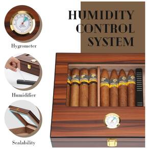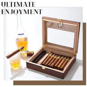Mantenha seus charutos frescos e bem conservados no umidor de Charutos Bald Eagle. Com vedação perfeita de madeira de cedro, mantém a umidade interna e bloqueia o ar externo, garantindo a qualidade dos charutos. Equipado com higrômetro mecânico, responde rapidamente à umidade interna. A madeira de cedro espanhola de alta qualidade absorve e libera umidade para manter a umidade uniforme. Fabricado com acabamento em nogueira elegante e detalhes intrincados, possui tampo de vidro para monitorar seus charutos e fundo de veludo para proteção. Embalagem premium, tornando-o um presente ideal para os amantes de charutos.