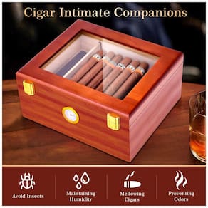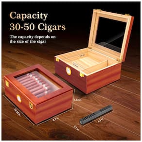 Controle Preciso de Umidade: Charutos exigem alta umidade. Nossa caixa de humidor de charutos possui um sistema de umidificação com um umidificador incorporado e um higrômetro preciso que mantém a umidade interna do humidor para charutos em 65-75%. Em tal ambiente, o tabaco do charuto fica devidamente hidratado e não resseca, mantendo seu sabor pleno, sendo uma ferramenta para preservação de charutos. Material Premium: A temperatura e o material da caixa de charutos vazia têm grande impacto na preservação dos charutos. Nosso estojo de humidor de charuto é feito à mão de cedro espanhol, com propriedades hidratantes e isolantes. Permite que os charutos envelheçam em um ambiente adequado, resultando em melhor sabor, aroma e qualidade. A caixa de charutos possui um divisor removível de cedro, permitindo que você coloque charutos de tamanhos comuns de forma estável, facilitando a organização. Sua vedação excelente: os sabores dos charutos são altamente suscetíveis a odores. Nosso humidor de mesa é feito de cedro espanhol e possui excelente desempenho de vedação, com bordas de vedação embutidas e um umidificador de charutos hermeticamente ajustado que mantém a umidade e a frescura dos charutos. Isso permite que o charuto mantenha seu aroma e sabor autênticos, proporcionando uma experiência autêntica de fumar. Artesanato Excepcional: A superfície do humidor de charutos é feita de laca de cozimento, simples e de alta qualidade, resistente ao desgaste e polida. O fundo de veludo resistente a arranhões evita que a caixa de armazenamento de charutos risque. A dobradiça dourada é suave, e a trava dourada acrescenta um toque de luxo ao humidor. A grande janela de vidro na parte superior combina praticidade e estética. A aparência geral é requintada, sendo um humidor para 25-50 charutos. Este kit de caixa de charuto de madeira é ideal para homens. Cultura: Os charutos têm uma cultura profunda. O set de caixa de humidor de charutos apresenta um estilo clássico e rústico, com grão de madeira vermelha de nogueira clássica e artesanato puro. Nossa caixa de charutos personalizada é uma homenagem a essa cultura. Ao abrir a tampa do pequeno humidor de charutos, os charutos arrumados parecem contar uma história. Cada vez que você pega um charuto, você é imerso no ritual. A atenção aos detalhes do estojo de charutos aumenta o prazer de degustação e a elegância de compartilhar.