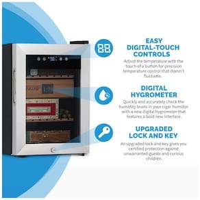 Resfrie seus Charutos Perfeitamente: Com nosso novo painel de controle digital sensível ao toque, você pode resfriar sua coleção de charutos até 11°C (52°F). Use os botões digitais de fácil acesso para controlar a temperatura interna do umidor.