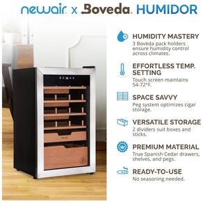 Armazene seus charutos com estilo e sofisticação com o umidificador de charutos Newair x Boveda de 500 unidades. Com design impecável, este umidificador possui três suportes para pacotes de umidade Boveda, que ajudam a regular e manter um nível de umidade específico dentro do umidificador, preservando assim a qualidade e o sabor dos charutos. Além disso, conta com controle digital de temperatura 12ºC a 23ºC para preservação ideal. O sistema de fixação ajustável garante um ajuste confortável para vários tamanhos de charutos, enquanto as divisórias de gaveta acomodam elegantemente caixas ou charutos individuais. Completo com uma alça superior embutida, o acesso à sua coleção é fácil. Este umidificador elétrico para charutos possui quatro prateleiras removíveis e ajustáveis de cedro espanhol com pinos ajustáveis para armazenar charutos em ótimas condições. As divisórias removíveis oferecem flexibilidade na forma como você organiza seus charutos dentro do umidificador, separando diferentes tipos de charutos, caixas ou palitos individuais, facilitando o acesso e a organização da sua coleção. A maçaneta localizada na parte superior da unidade oferece uma maneira conveniente de abrir e fechar a porta do umidificador, melhorando a experiência geral do usuário ao acessar seus charutos.