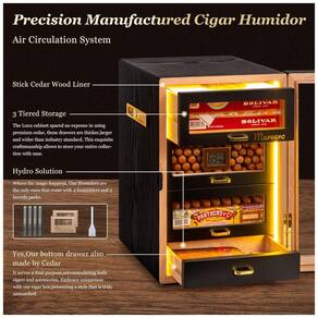 O umidor de Charuto da Marvero tem capacidade para 200 charutos e oferece 5 gavetas de cedro removíveis com alças, ideais para a maioria dos umidificadores de charutos elétricos. Feito com materiais de qualidade, como revestimento de cedro natural que mantém a umidade e o frescor dos charutos, e uma durável porta de vidro temperado que permite uma fácil observação dos níveis de umidade, garantindo proteção abrangente para sua coleção de charutos. Com um design maravilhoso, com gabinete arredondado, gaveta de noz marrom e hardware banhado a ouro em ambos os lados, o umidor da Marvero se destaca no mercado. Possui 4 umidificadores, 2 pacotes de umidade e um higrômetro digital frontal para monitoramento fácil da umidade. Além disso, conta com um sistema de iluminação LED trilateral para facilitar a observação dos charutos e pode ser alimentado por bateria ou cabo Type-C, oferecendo portabilidade e confiabilidade. Um presente esplêndido para apreciadores, ideal para bares, escritórios ou estudos. Perfeito como presente para pais, maridos ou amigos.