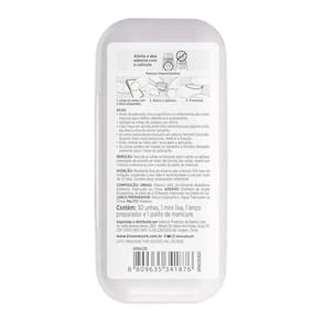 Modo de Usar Abra a embalagem e comece selecionando os tamanhos ideais para as suas 10 unhas (caso esteja em dúvida, opte pela opção de menor tamanho). Utilize o lenço preparatório incluso para limpar quaisquer resíduos e garantir uma melhor aderência. Alinhe a aba adesiva à cutícula e, em seguida, retire a película protetora, pressionando firmemente, do meio para os lados. A remoção é super simples, basta retirar gentilmente pelos lados utilizando um pedaço de algodão e acetona.