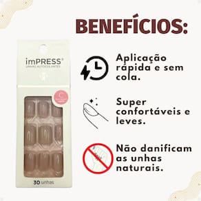 As Unhas Postiças Autocolantes imPRESS são a melhor opção para você que busca resultado de salão em casa. Com tecnologia Super Hold, a dupla camada de adesivo é a responsável por garantir unhas perfeitas por até 7 dias, sem danificar suas unhas naturais. Todos os modelos têm o diferencial da tecnologia Pure Fit, que conta com cutículas afiladas e pontas 14% mais finas e resistentes que proporcionam um encaixe perfeito, além de um acabamento muito mais natural.