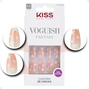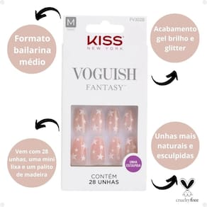 As suas unhas exclusivas para momentos exclusivos chegaram! A unha esculpida Voguish Fantasy In The Stars da Kiss New York no formato bailarina a médio possue acabamento gel brilho e glitter tudo isso com encaixe perfeito. Resultado de salão em casa em poucos minutos. Vem com 28 unhas, uma mini lixa e um palito de madeira.
