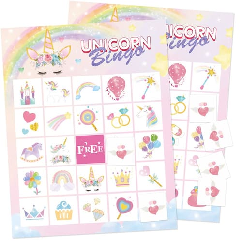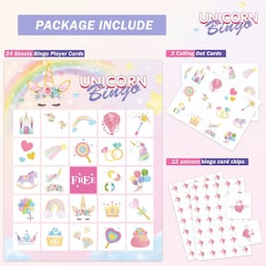 Familiares reunidos não têm novos jogos de festa para jogar? Ainda não planejou as atividades para o aniversário do seu filho? Nosso jogo de bingo de unicórnio, fácil de carregar e jogar, será uma boa escolha. Como jogar: 1. Dê a cada jogador um cartão de jogador de BINGO e várias fichas de jogo. 2. Faça com que cada jogador coloque uma ficha de jogador sobre a grade das cartas do jogador. 3. Coloque os chips do chamador em uma tigela. 4. O chamador escolheria um chip de chamada da tigela e gritaria o nome. Cada jogador usaria a ficha do jogador para marcá-la. Quando cada jogador tiver feito isso, coloque o chip do chamador de volta e pegue um novo; e assim por diante. 5. O primeiro jogador a fazer uma linha de 5 itens na diagonal, horizontal ou vertical (incluindo a grade ) grita BINGO e vence o jogo. 6. Se ninguém ganhar, continue ligando até que alguém diga BINGO! Nossa loja tem outros suprimentos para festas de unicórnios para tornar sua festa temática de unicórnio mais perfeita. - JOGO DE BINGO DE UNICÓRNIO: Estes cartões de bingo de unicórnio na caixa colorida apresentam diferentes padrões de papelão, tornando-os o presente perfeito para seus convidados/filhos. - MATERIAL DURÁVEL: Feito de papelão de alta qualidade com cores vibrantes, o conjunto de jogos de festa de unicórnio foi feito para durar e pode ser utilizado repetidamente. - FÁCIL DE JOGAR: basta fazer com que o chamador escolha uma ficha da tigela e marque a palavra chamada em seu cartão. O primeiro jogador a cobrir uma linha e gritar “bingo” ganha! - TUDO O QUE VOCÊ PRECISA: O pacote inclui 24 cartas de jogador, 420 fichas de jogo, 2 fichas de chamada e um manual de instruções do jogo, você pode começar a jogar imediatamente. - PERFEITO PARA QUALQUER OCASIÃO: O kit de cartelas de bingo é compacto e leve, facilitando o transporte na bolsa e o jogo em qualquer lugar. Perfeito para festas de aniversário infantis com tema de unicórnio, atividades escolares, reuniões familiares e muito mais.