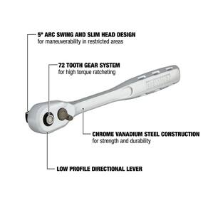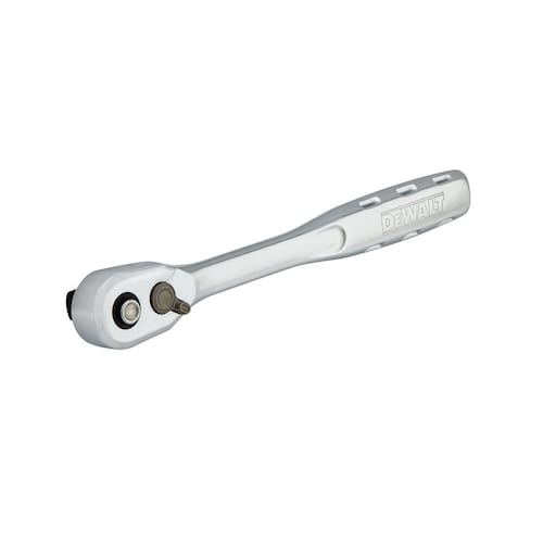 DEWALT Chave catraca, liberação rápida, SAE, unidade de 1/2 polegada (DWMT81098) - A catraca de 1/2 possui mecanismo de botão de liberação rápida para trava positiva nos soquetes - O design de arco de 5 graus e cabeça fina da chave de catraca é feito para manobrabilidade em áreas restritas - Sistema de engrenagem de 72 dentes para catraca de alto torque - Alça projetada ergonomicamente com ranhuras antiderrapantes para conforto e controle - Estrutura de aço cromo vanádio para resistência e durabilidade - Alavanca direcional de baixo perfil - Atende ou excede os padrões ANSI/ASME