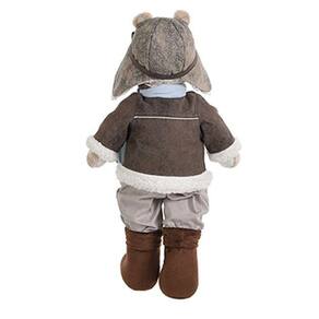 Urso de pelúcia bochecha tem jaqueta que imita couro antigo, chapéu e óculos, sua bota é fixa no pé, garantindo que ela não se perca nas mais deliciosas brincadeiras.