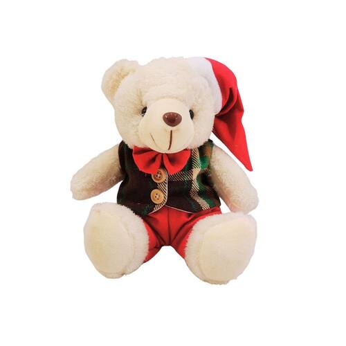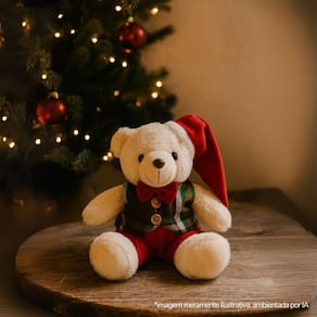 Encante sua decoração de Natal com este Urso de Pelúcia Prime em tom creme, vestido com traje xadrez vermelho e verde e delicado gorro e gravata vermelha, que traz um ar aconchegante e sofisticado à sua casa.