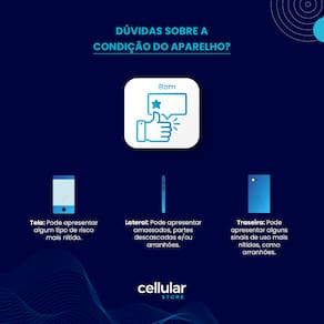 Atenção: Produtos apresentam alguns sinais de uso como pequenos riscos, mas nada que interfira em seu funcionamento. Produto que já foi usado, ou seja, não é mais considerado um produto novo, mas que está totalmente desbloqueado para todas as operadoras, reconfigurado de acordo com os padrões do fabricante (sem dados de terceiros) e pronto para uso.