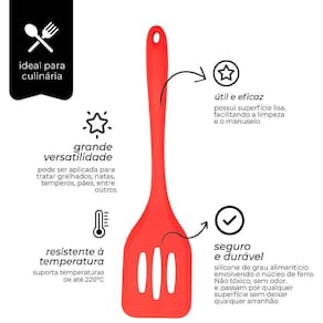 Quer um produto com maior durabilidade e eficiência para o seu dia a dia mais simplicidade na sua vida na cozinhaEsta espátula feita em silicone de extrema qualidade para transformar o jeito que você prepara seus alimentos, super fácil de se usar e realmente muito bonito este item vai fazer a diferença na sua cozinhaPeça que une a elegância com a utilidade, seu acabamento nas cores vermelha e preta, esta espátula foi feita para quem busca uma cozinha mais linda e arrumada vai deixar seus momentos mais bonitos e descontraídos por ser feito de silicone de ótima qualidade, esse utensílio vai durar por muito tempo em sua cozinha, ele também ajuda a evitar acidentes durante o preparo- Higiênico e de fácil limpeza- Pode ir na lava louças- Suporta 230graus e não derrete- Não arranha panelas- Peso aprox: 300g cada- Medidas: 29cm