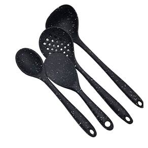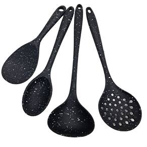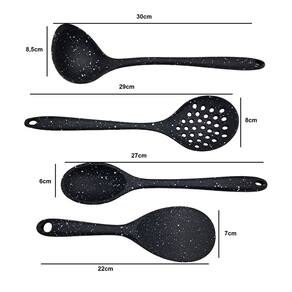Ideais para proteger suas panelas antiaderentes de arranhões, os talheres que compõem esse kit são fabricados em material de silicone e nylon de ótima qualidade, também são resistentes a altas temperaturas e livres de BPA. – Fácil de limpar: podem ser lavados na máquina de lavara louça – Duráveis, flexíveis, não se deformam – Não riscam a panela – Possuem furo para pendurar– Material: Silicone e Nylon– Cor: Preto Contém: 1 concha (30cm x 8,5cm) 1 colher (27cm x 6cm) 1 colher de arroz (22cm x 7cm) 1 escumadeira (29cm x 8cm)