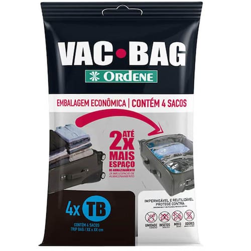 O Vac Bag Trip 4 é um conjunto de sacos a vácuo projetados especificamente para viagens. Cada saco possui dimensões de 60x40cm, o que os torna ideais para guardar roupas, cobertores, toalhas e outros itens volumosos durante as viagens, otimizando o espaço na sua bagagem. Esses sacos a vácuo são reutilizáveis, o que significa que você pode usá-los repetidamente em diferentes viagens. A principal característica desses sacos a vácuo é a capacidade de remover o ar, reduzindo o volume dos itens armazenados. Quando o ar é removido do saco, ele cria um vácuo interno, comprimindo o conteúdo e permitindo que você empilhe e armazene mais itens em sua bagagem. Vac Bag Trip 4 é impermeável, o que significa que seus itens estarão protegidos contra a umidade e a água durante a viagem. Isso é especialmente útil se você estiver viajando para destinos com clima úmido ou se houver chances de seus itens entrarem em contato com líquidos.
