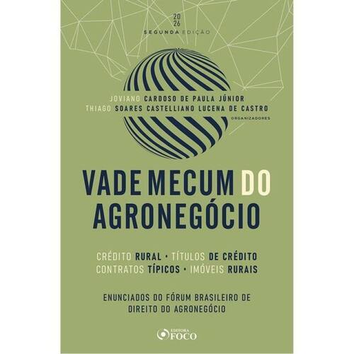 Sobre a obra Vade Mecum do Agronegócio - 2ª Ed 2026 O agronegócio brasileiro foi responsável por 23,8% do Produto Interno Bruto (PIB) do país em 2023, possui mais de 5.000 estabelecimentos rurais e emprega cerca de 18 milhões de pessoas, segundo o Instituto Brasileiro de Geografia e Estatística – IBGE. O sucesso dessa transformação econômica e social no campo é multifatorial, e pode ser atribuído: i) a políticas públicas permanentes de subsídios financeiros, incentivos tributários e concessão de crédito; ii) o desenvolvimento tecnológico e científico da atividade rural, com importante destaque para as pesquisas realizadas pela Empresa Brasileira de Pesquisa Agro pecuária – EMBRAPA e, é claro, iii) ao empreendedorismo dos agricultores brasileiros que são competentes, proativos, organizados e, acima de tudo, resilientes. Essa transformação também ocorreu no direito aplicado ao agronegócio brasileiro, com consequências nas relações obrigacionais, com contratos cada vez mais complexos, a exemplo da comercialização em bolsa de valores e preços fixados em dólar; em garantias contra tuais intricadas; com a criação de diversas modalidades de títulos de crédito específicos para a atividade rural; e financiamentos rurais suscetíveis aos impactos dos eventos climáticos. É nesse contexto que os profissionais do Direito se deparam com novos e maiores desafios na interpretação de um conjunto de normas entrelaçadas, exigindo visão sistêmica da legislação aplicada ao Agronegócio. A Editora FOCO apresenta as principais normas jurídicas aplicadas ao crédito rural, aos títulos de crédito, aos contratos típicos e os imóveis rurais com a intenção de oferecer ferra menta de pesquisa aos profissionais e acadêmicos da área jurídica. Nesta 2ª edição, onde a legislação foi atualizada, a editora apresenta, também, os enuncia dos aprovados no 1º Fórum Brasileiro de Direito do Agronegócio – FBDA, realizado em 2025, na cidade de Goiânia. O FBDA tem por objetivo a proposição, discussão e deliberação de enunciados sobre questões jurídicas para o Agronegócio brasileiro, visando uniformizar entendimentos e oferecer diretrizes para a comunidade jurídica. O Fórum teve o apoio institucional da União Brasi leira dos Agraristas Universitários – UBAU, do Instituto Brasileiro de Direito do Agronegócio – IBDA, da Sociedade Rural Brasileira - SRB, da Sociedade Nacional da Agricultura – SNA, da Universidade de Rio Verde - UniRV, da Comissão de Direito Agrário da OAB/GO e do Instituto Goiano de Direito – IGD. Boa leitura! Os organizadores Joviano Cardoso de Paula JúniorThiago Soares Castelliano Lucena de Castro
