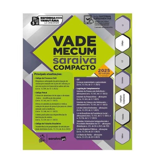 Leve para onde quiser. Encontre o que precisa na hora! O Vade Mecum Saraiva Compacto – 31ª Edição 2025 foi pensado para estudantes e profissionais que precisam de agilidade sem abrir mão da qualidade. Com a estrutura inteligente desenvolvida pela Saraiva Jur, você encontra as normas mais relevantes por meio de índices multifuncionais, notas de correlação entre matérias e acesso online à legislação complementar. Perfeito para quem precisa de uma fonte de pesquisa prática, atualizada e acessível. Tudo isso com a tradição, confiabilidade e inovação da Saraiva Jur. Por que escolher o Vade Mecum Saraiva Compacto – 31ª edição 2025? - Mais leveza e mobilidade no seu dia a dia: formato compacto, fácil de transportar e usar em qualquer lugar. - Encontre as normas com rapidez: índices multifuncionais e organização estratégica que facilitam sua consulta. - Mantenha-se atualizado: serviço exclusivo "Atualize seu Código", com atualizações semanais e conteúdo adicional online. Principais Atualizações da 31.ª edição: Código de Processo Civil Dispensa o advogado da antecipação de custas processuais em ações de cobrança e em execuções de honorários advocatícios (Lei n. 15.109, de 13-3-2025) Código Penal Crimes de abandono de incapaz e de maus-tratos – modificação das penas (Lei n. 15.163, de 3-7-2025) Altera circunstância atenuante e veda a redução do prazo de prescrição para os crimes sexuais contra mulheres (Lei n. 15.160, de 3-7-2025) Crimes praticados nas dependências de instituição de ensino (Lei n. 15.159, de 3-7-2025) Código de Trânsito Brasileiro Transferência de propriedade de veículo por meio eletrônico (Lei n. 15.153, de 26-6-2025) CLT Licenças-maternidade e paternidade (Lei n. 15.156, de 1.º-7-2025) Legislação Complementar Estatuto da Pessoa com Deficiência – alterações (Lei n. 15.163, de 3-7-2025) Estatuto da Pessoa Idosa – alterações (Lei n. 15.163, de 3-7-2025) Estatuto da Criança e do Adolescente – alterações (Lei n. 15.163, de 3-7-2025) Lei dos Crimes Hediondos – alterações (Lei n. 15.159, de 3-7-2025) Lei de Benefícios da Previdência Social – alterações (Leis n. 15.157, de 1.º-7-2025, e n. 15.156, de 1.º-7-2025) Lei dos Registros Públicos – alterações (Lei n. 15.139, de 23-5-2025) Lei Maria da Penha – alterações (Lei n. 15.125, de 24-4-2025) Súmulas, Orientações Jurisprudenciais e Precedente Normativo do TST Cancelamento das Súmulas n. 90, 114, 152, 219, 228, 268, 277, 294, 307, 311, 320, 329, 366, 375, 377, 423, 426, 429, 437, 439, 444, 449, 450, 452; da Orientação Jurisprudencial n. 13 do Tribunal Pleno/Órgão Especial; das Orientações Jurisprudenciais n. 14, 270, 355, 383 e 418 da Subseção I Especializada em Dissídios Individuais; da Orientação Jurisprudencial Transitória n. 36 da Subseção I Especializada em Dissídios Individuais; da Orientação Jurisprudencial n. 16 da Seção de Dissídios Coletivos e o Precedente Normativo n, 100 (Resolução n. 225, de 30-6-2025 do TST) ?
