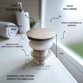 Válvula Click Prata Escovada para Cuba de banheiro Esta válvula click traz a alta tecnologia sofisticação e qualidade, ideais para quem busca praticidade e eficiência. Com a função do escoamento da agua, possui um sistema rapido e simples com um clique, ela abre e fecha. Evita a entrada de insetos e do mau cheiro. Verifique as medidas do produto antes de efetuar a compra Especificações do produto: Válvula de escoamento Sistema Click Abre/Fecha ao apertar Para cubas de banheiro Não enferruja Evita o mau cheiro Evita a entrada de insetos Diâmetro 4,0 cm 1 ano contra defeito de fabricação Dimensões do produto nas fotos Informações Técnicas: marca: Reno material: Aço Inox formato: Redondo cor: Prata Escovada diâmetro 4,0 cm ATENÇÃO: Não incluso cuba e torneira. Marca: Não Informado