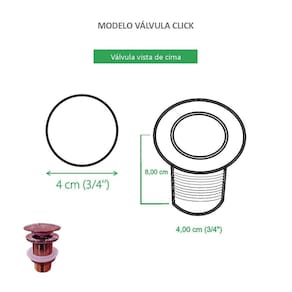 Válvula Click Rose Gold para Cuba de banheiro Esta válvula click traz a alta tecnologia sofisticação e qualidade, ideais para quem busca praticidade e eficiência. Com a função do escoamento da agua, possui um sistema rapido e simples com um clique, ela abre e fecha. Evita a entrada de insetos e do mau cheiro. Verifique as medidas do produto antes de efetuar a compra Especificações do produto: Válvula de escoamento Sistema Click Abre/Fecha ao apertar Para cubas de banheiro Não enferruja Evita o mau cheiro Evita a entrada de insetos 1 ano contra defeito de fabricação Dimensões do produto nas fotos Informações Técnicas: Marca: Reno Material: Aço Inox Formato: Redonda Cor: Rose Gold Acabamento: Brilho Atenção: Não incluso cuba e torneira. Dúvidas a Banho&Casa estará à disposição para atendê-lo de segunda a sexta das 8:30 - 17:30 hrs. Marca: Não Informado