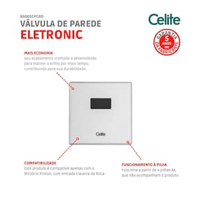 A válvula de acionamento para o mictório da Celite foi desenvolvida para ressaltar o ambiente do mictório, é ideal para ambientes públicos, onde a higiene, segurança e sustentabilidade são fatores importantes. Além disso, com uma simples passada de mão, é possível realizar o acionamento da água. Por se tratar de um item produzido em ABS Cromado e metal, a válvula E-eletronic 2.0 tem menor risco de enferrujar, tendo também, suas superfícies lisas, o que evita o acúmulo de sujeira ao redor do produto. O material da válvula faz com que seu brilho permaneça por mais tempo, contribuindo para sua durabilidade.