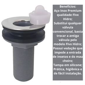 Benefícios: Aço Inox Premium qualidade Flvx Hidro; Substitui qualquer válvula convencional, basta trocar a antiga válvula pelo modelo Flvx Hidro; Possui vedação que impede a entrada de insetos e do mau cheiro; Tampa em silicone; Prática, higiênica e de fácil instalação.