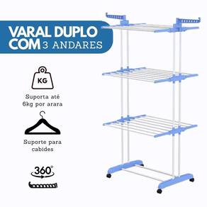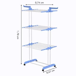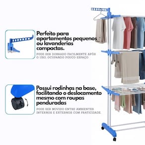 Principais Benefícios: Compacto e funcional – perfeito para áreas pequenas e lavanderias reduzidas 3 andares dobráveis – mais espaço para secar roupas sem ocupar o ambiente Sapateira integrada – ótimo para secar tênis, chinelos e sapatos 2 cabideiros laterais + abas retráteis – acomoda até 16 cabides Rodinhas giratórias 360° – fácil de mover mesmo com roupas molhadas Montagem sem ferramentas – fácil de montar, desmontar e guardar