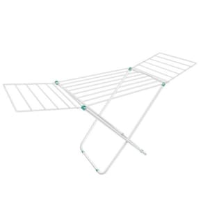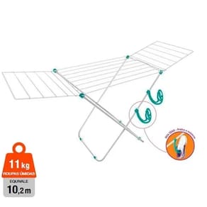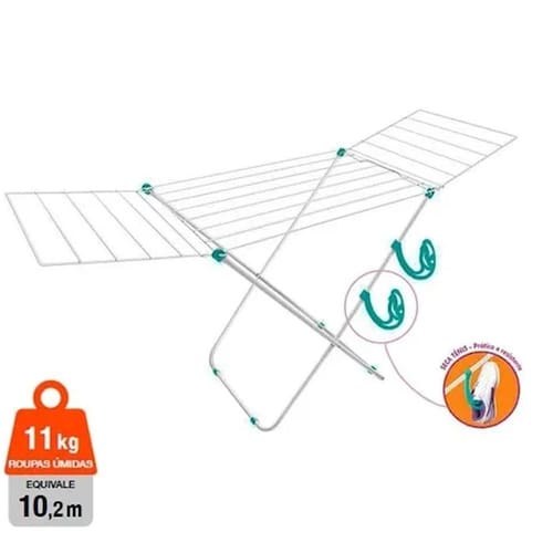 Descrição Características do produto Capacidade de roupas úmidas: 11 kg Equivale: 10,20 m Cor da estrutura: branco Cor do acabamento: verde Portátil: sim Dobrável: sim Aba: sim Varetas do quadro: 8 Varetas da aba: 2 abas com 5 varetas cada