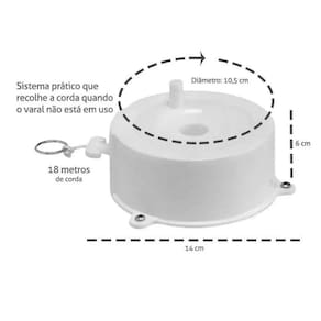 VARAL DE PAREDE ESTICAR STICK BRANCO COM CORDA DE 18M SECALUXPrático sistema que recolhe a corda quando o varal não está em uso. Ocupa pouco espaço quando recolhido. Fácil instalação. Feito com material resistente, alta durabilidade.Características do ProdutoCapacidade de roupas úmidas: 7 kgEquivale: 18 mCor da estrutura: BrancoPortátil: NãoAjuste de altura: NãoDobrável: NãoCordas: 1 corda com 18 m.Contém:01 unidade de varal;13 unidades de bucha;10 unidades de gancho;03 unidades de parafuso.Precauções de uso: Evite acidentes. Mantenha o produto fora do alcance de crianças. Cuidado ao instalar/manusear o produto, pois o mesmo pode gerar perfuração/esmagamento nos dedos.Nota: As medidas do produto podem sofrer uma variação de tamanho de + ou ? 2cm.Composição do ProdutoEstrutura do produto: PolietilenoAcabamento plástico: PolipropilenoParafusos/Ganchos/Rebites: Aço zincadoInformações da EmbalagemMedidas da peça A/L/P (m): 0,290 x 0,180 x 0,080Medidas da caixa A/L/P (m): 0,395 x 0,300 x 0,195Dimensões do ProdutoMedidas do produto: 0,14 x 0,14 x 0,065Conteúdo da embalagem: 01 VARAL DE PAREDE*Garantia: 03 meses contra defeitos de fabricação.*Imagens Meramente Ilustrativas.*Objetos de decoração das fotos não estão inclusos.*As cores podem variar conforme monitor/smartphone utilizado para a visualização do anúncio.