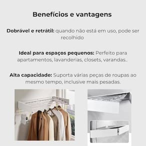 7894100135310varal Retrátil de Parede 60cm, Economia de Espaço com Estilo Transforme qualquer cantinho da sua casa em um espaço funcional e organizado com o nosso varal retrátil dobrável de parede de 60cm Com um design moderno, minimalista e extremamente prático, ele é a solução ideal para quem precisa de versatilidade sem abrir mão da elegância. Pronto para surpreender: Com apenas 4cm de profundidade quando fechado, passa quase despercebido no ambiente. Aberto, oferece 60cm de estrutura firme e resistente para secar roupas, pendurar toalhas, organizar sapatos ou até brinquedos Ideal para: Lavanderias pequenas Quartos e closets Banheiros Varandas Quartos infantis como porta-brinquedos Fácil de instalar, acompanha suporte para fixação na parede. Características Técnicas: Material: Aço com Pintura eletrostática Tamanho aberto: 60cm largura x 40cm profundidade x 9,5cm altura Tamanho fechado: Apenas 4cm de profundidade Dobrável e retrátil: Ganhe espaço com praticidade Cores disponíveis: Branco Peso aproximado: Leve e fácil de manusear Instalação: Fixação direta na parede com parafusos inclusos Este varal também pode ser como suporte para roupas passadas, organizador de roupas do dia a dia ou até mesmo como expositor de produtos leves em lojas físicas