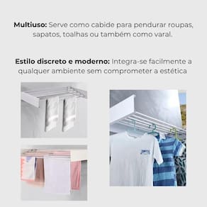 Varal Retrátil de Parede 80cm Economia de Espaço com Estilo Transforme qualquer cantinho da sua casa em um espaço funcional e organizado com o nosso varal retrátil dobrável de parede de 80cm Com um design moderno, minimalista e extremamente prático, ele é a solução ideal para quem precisa de versatilidade sem abrir mão da elegância. Pronto para surpreender: Com apenas 4cm de profundidade quando fechado, passa quase despercebido no ambiente. Aberto, oferece 80cm de estrutura firme e resistente para secar roupas, pendurar toalhas, organizar sapatos ou até brinquedos Ideal para: Lavanderias pequenas Quartos e closets Banheiros Varandas Quartos infantis como porta-brinquedos Fácil de instalar, acompanha suporte para fixação na parede. Características Técnicas: Material: Aço com Pintura eletrostática Tamanho aberto: 80cm largura x 40cm profundidade x 9,5cm altura Tamanho fechado: Apenas 4cm de profundidade Dobrável e retrátil: Ganhe espaço com praticidade Cores disponíveis: Branco Peso aproximado: Leve e fácil de manusear Instalação: Fixação direta na parede com parafusos inclusos Este varal também pode ser como suporte para roupas passadas, organizador de roupas do dia a dia ou até mesmo como expositor de produtos leves em lojas físicas do vendedor: 1 meses