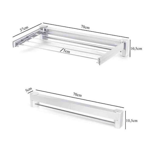 O Varal Mágico De Parede Retrátil 5 Varetas Seca Roupas é compacto e fabricado em aço inoxidável e ABS, garantindo durabilidade e resistência. Sua cor branca combina com qualquer decoração, e seu tamanho aberto é de 70 x 10,5 x 37cm, enquanto o tamanho fechado é de 70 x 10,5 x 5cm.