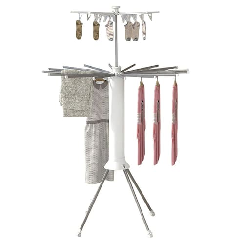 Esqueça os varais convencionais e desfrute da praticidade e eficiência do Varal de Roupas Vertical 2 Andares com suporte para cabides, rodinhas que giram 360º e a capacidade de economizar espaço quando necessário.