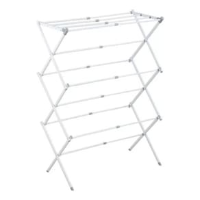 Composição: Ferro e PP Polipropileno Peso Aproximado: 2 kg Dimensões Montado: Altura: 103 cm Comprimento: 37 cm Largura: 40 cm Dimensões Fechado: 43 cm x 51 cm Cor: Branco e Cinza Capacidade: Suporta até 10 kg de roupas úmidas Varetas: 11 varetas extensíveis