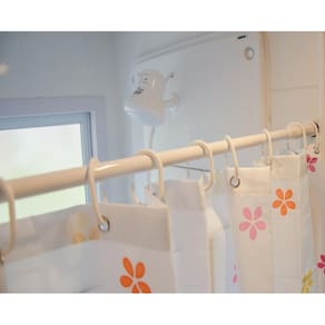 Caso utilizado como varão para cortina de box, item muito acessível, principalmente para cadeirantes, facilitando a entrada no box, unindo a praticidade com a organização.
