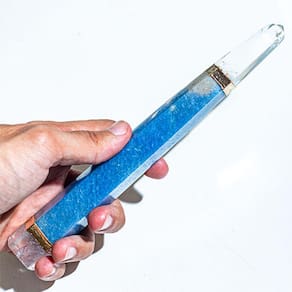 A base e a ponta de cristal adicionam um elemento de estabilidade e amplificação às energias do quartzo azul. A base, feita de cristal, atua como um ancoradouro, conectando-nos à terra e ajudando a equilibrar nossas energias durante o uso da varinha.