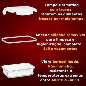 O Pote Retangular com Tampa Hermética é ideal para o dia a dia e garante o armazenamento adequado de diversos alimentos. Fabricado em vidro super resistente, pode ser lavado ao forno, microondas (sem a tampa) e freezer. Além de manter os alimentos frescos por mais tempo, evita que o cheiro se espalhe e sem risco de vazamentos. Possui 4 (quatro) travas de fácil limpeza e higienização. CONTÉM: 1 unidade DIFERENCIAIS - Anel de silicone removível- Possui 4 travas- Mantém os alimentos frescos por mais tempo- Suporta uma variação térmica de até 300C (não é indicado dar choque térmico)- Evita que o cheiro se espalhe devido a sua super vedação- Vai ao forno convencional (sem a tampa), forno elétrico (sem a tampa), microondas (sem a tampa) e freezer- Tampa livre de BPA (Bisfenol A), ou seja, não é tóxica- Fácil de limpar e higienizar, pois pode tirar a vedação para limpeza- Sem risco de vazamento devido a sua super vedação- Super resistente, Vidro Borosilicato FICHA TÉCNICA: Modelo: Pote de Vidro Retangular - Click Glass Material: Vidro Vidro Borosilicato, tampa de plástico e anel vedação de silicone Pote retangular com vedação resistente ao calor Cor do Pote: Transparente Cor da Vedação de Silicone: Branco Composição: Vidro Borosilicato Tamanho: 22cm x 17cm x 8cm (Comprimento x Largura x Altura)Capacidade: 1040ml Peso: 800g Contém: Pote Vidro Hermética Marmita Tampa Silicone 1040ml Grande